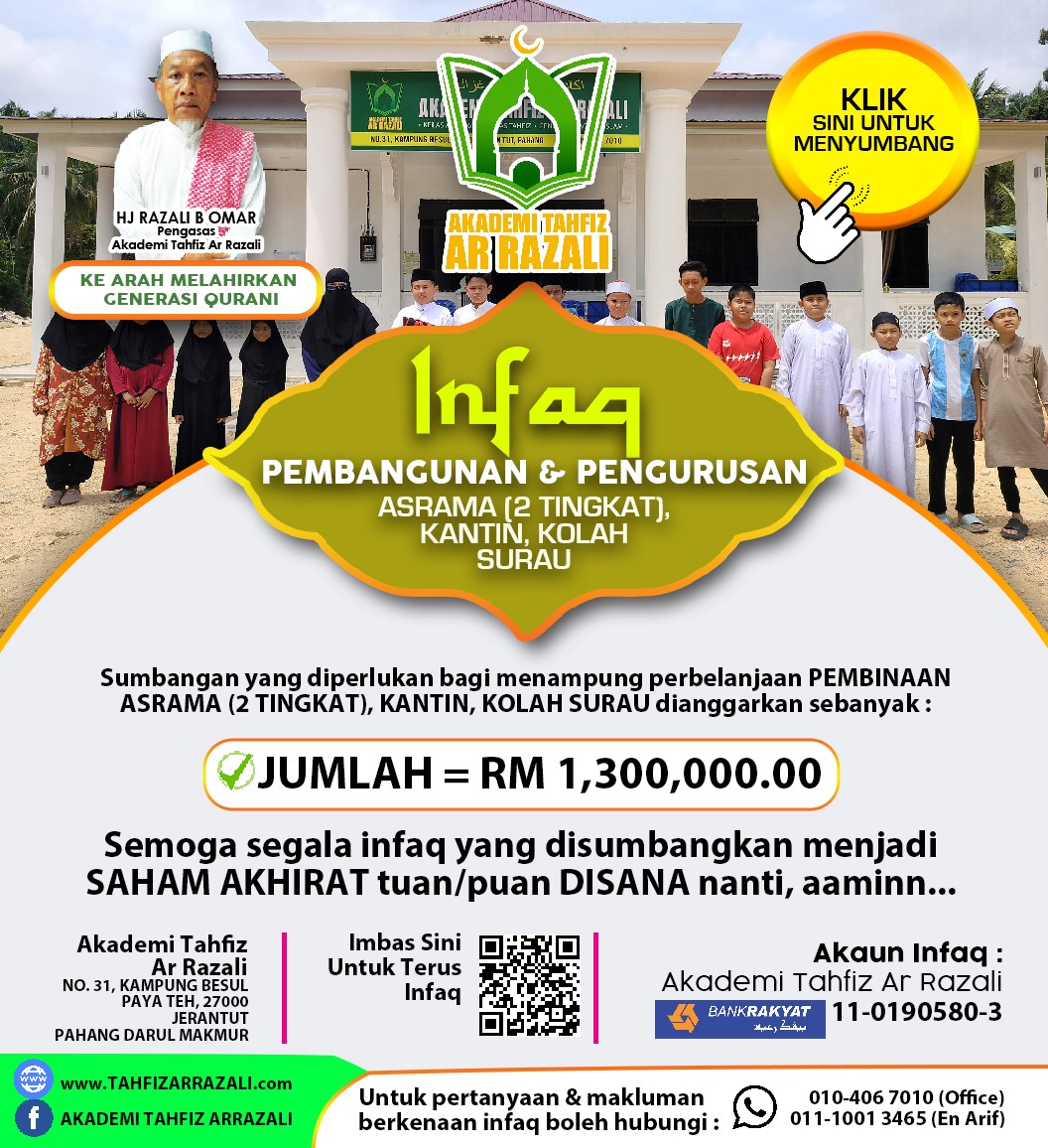 Kini, Akademi Tahfiz Ar Razali sedang mengorak langkah setapak ke hadapan iaitu akan memulakan pembinaan infrastruktur bagi FASA 2 iaitu ASRAMA (1 TINGKAT) & KOLAH SURAU.